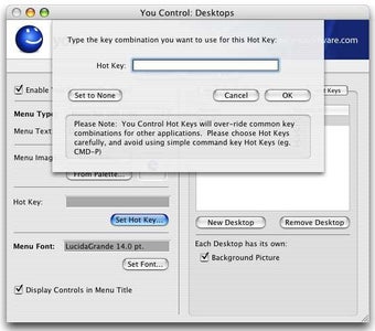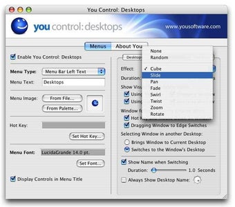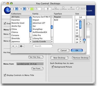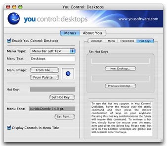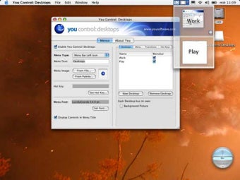 You Control: Desktop es probablemente la mejor aplicación del género, ya que nos permite crear tantos escritorios virtuales como queramos, accesibles a través de un nuevo menú ubicado en la barra de menús del sistema. Allí mismo podremos visualizar cada uno de los escritorios creados en miniatura. Para pasar de uno al otro, nada más fácil que un simple clic encima del escritorio deseada y está en el bote.